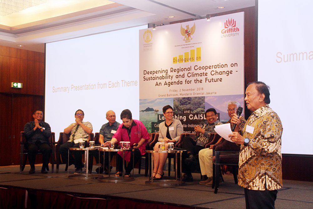 Special mention must be made of the fact that the collaborative program reflects nearly ten years of engagement and collaboration in Indonesia, led in particular by Dr Peter Davey — Director of the Centre of Excellence for Sustainable Development for Indonesia, as well as Professor Cordia Chu and Professor Brendan Mackay. Further special mention should also be made of Rachmat Witoelar an adjunct professor and longstanding friend of Griffith University, for his tireless championing of climate change issues and his deep optimism for the role that Australia and Indonesia might play together to address the pressing challenges before us.