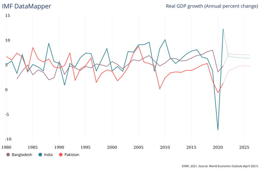 The Bangladesh government has recently announced that the country’s per capita GDP has risen to USD 2,227 thus consolidating its position as a lower-middle-income economy. This has happened despite the adverse shock of the current global pandemic because the country managed to maintain its rapid pace of growth. Indeed, from being a growth laggard relative to its powerful neighbours, Bangladesh has emerged as a growth leader. It did not even suffer a recession during the first wave of COVID-19 in 2020 – see the figure below culled from IMF DataMapper. The projections to 2025 suggest that Bangladesh will grow significantly faster than either India or Pakistan.