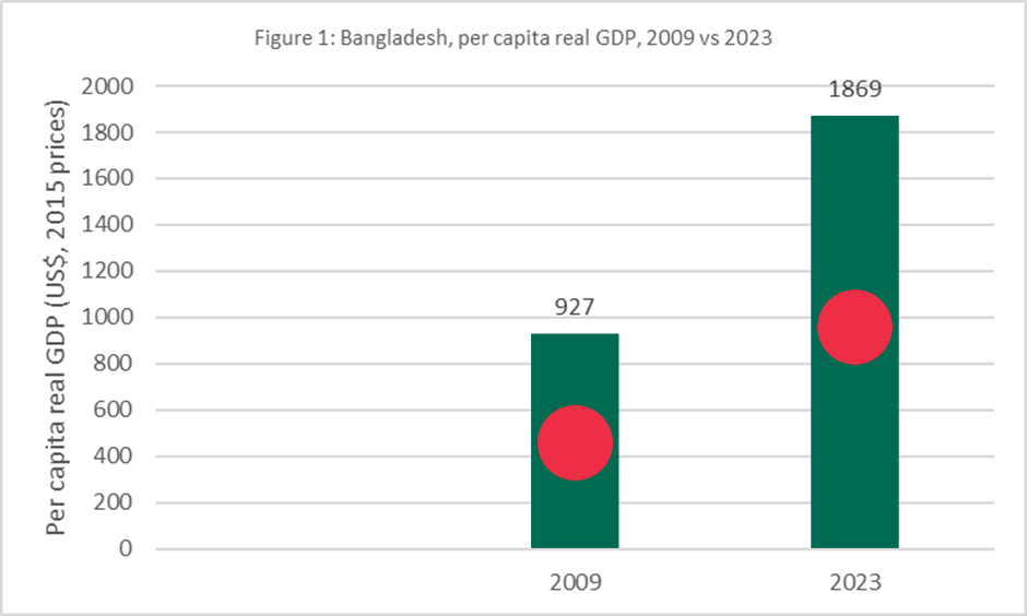 Hasina’s legacy is complex and her regime represents a cruel paradox. Despite her regime’s political repression, Bangladesh experienced significant economic and social progress under her leadership. Growth was sustained and rapid leading to a doubling of real per capita income between 2009 and 2023 – see Figure 1. Poverty fell significantly, and life expectancy increased substantially – see Figures 2 and 3. The garments industry and remittances continued to drive the economy, while new sectors like pharmaceuticals and shipbuilding emerged. Large infrastructure projects also enhanced connectivity within the country. A UN assessment also noted that ‘the country is internationally recognised for its good progress on several gender indicators’.