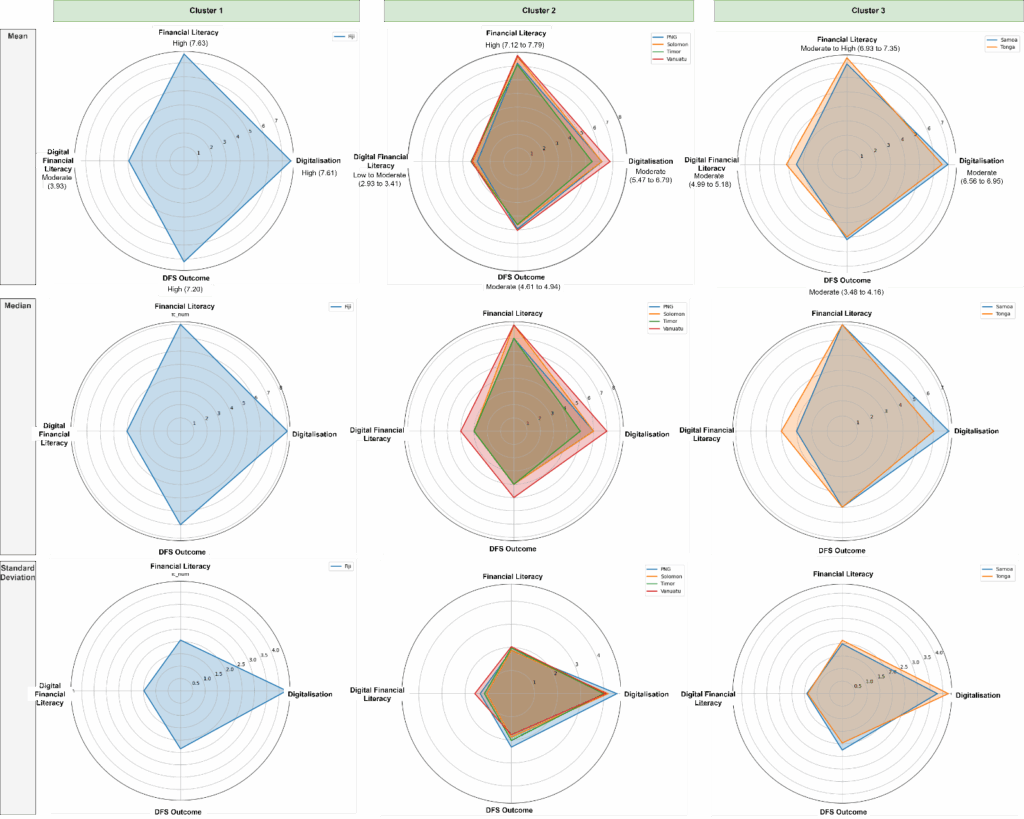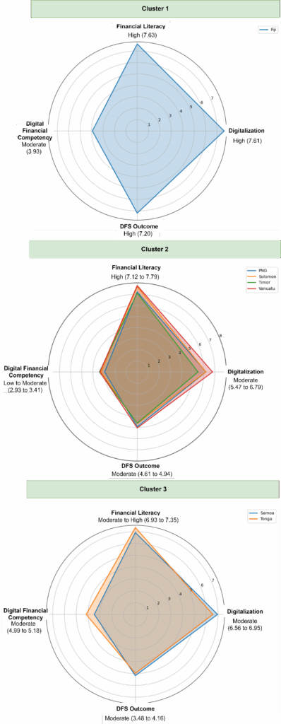 As the country with the highest total score, Fiji possesses distinct characteristics compared to others. Its high digitalisation and digital financial competency indicate a correlation with the high DFS outcome and DFL score. On the other hand, low digital financial competency is observed among PNG, Solomon Islands, Timor-Leste, and Vanuatu. Analysis of this cluster also further suggests the role of digital skills in improving DFS outcomes, irrespective of the DFL score. Moderate competencies in digitalisation, financial literacy and DFS outcomes are found in Tonga and Samoa, resulting in a moderate DFL, second to Fiji. However, the role of digital financial competency in impacting the DFL score becomes more prominent in this cluster.