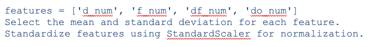 - Use the selected features (d_num, f_num, df_num, do_num) with their mean and standard deviation values.