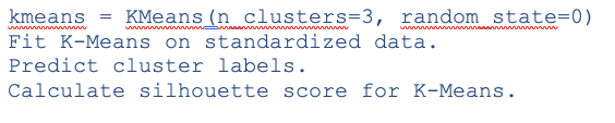 - Initialise K-Means with a predefined number of clusters (n_clusters=3) and fit it to the standardised data.