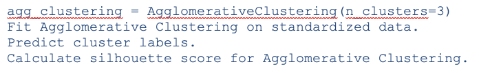 - Apply Agglomerative Clustering with the same number of clusters (n_clusters=3).