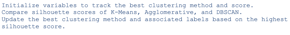 - Compare silhouette scores and choose the algorithm with the highest score as the best clustering method.
