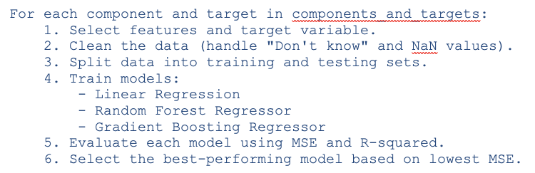 Objective: Train and evaluate machine learning models to predict a target variable within each component and determine the best-performing model.