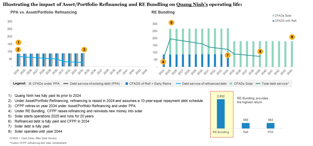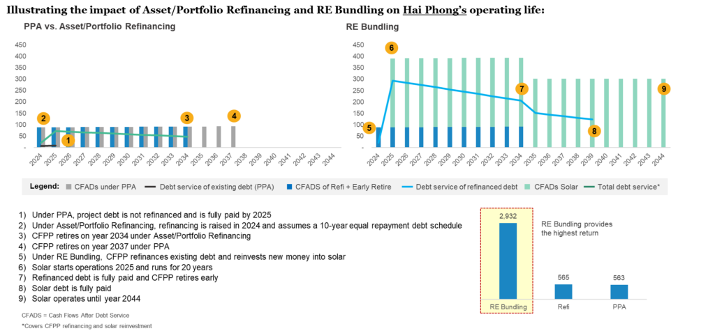 The sample cash flows of Thang Long’s operating life are mapped under the original PPA and with asset/portfolio refinancing and RE bundling applied (Figure 8). Compared with completing the PPA (retiring in the year 2042), refinancing allows Thang Long to retire 8 years earlier while generating positive CFADs. It would not generate a higher return as the existing sculpted debt provides a better cash profile for free cash flow to equity (FCFE) than refinancing. When bundled with solar investment, however, Thang Long could still retire 8 years earlier and generate a higher return with cash flows from solar projects.