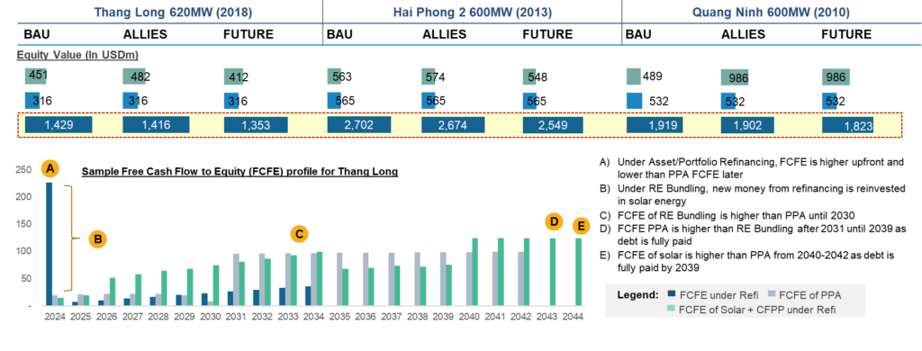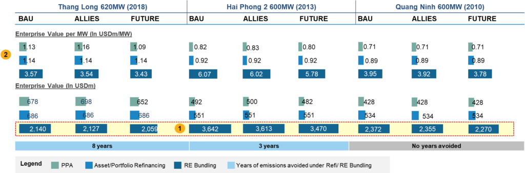 For all three CFPPs in Vietnam, RE Bundling produces the highest valuation in any scenario, especially for Hai Phong as its age and debt capacity are the most optimal for maximising refinancing and generating new money for RE. Under PPA and Refinancing, Thang Long’s enterprise valuation is highest as it has more operational years than the two older CFPPs.