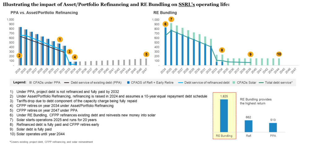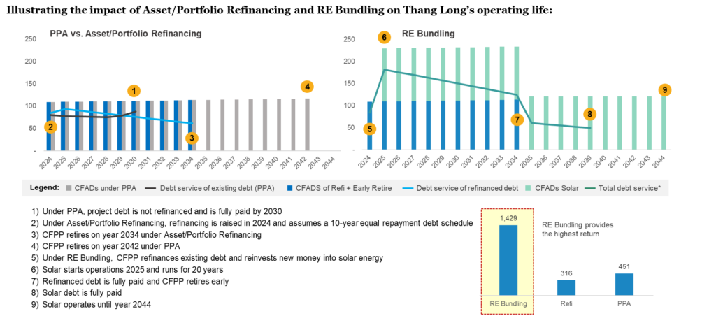 The sample cash flows of Thang Long’s operating life are mapped under the original PPA and with asset/portfolio refinancing and RE bundling applied (Figure 11). Compared with completing the PPA (retiring in the year 2047), SSRL pays off the debt in the year 2032 and retires 13 years earlier (in the year 2034) under Asset/Portfolio Refinancing. If bundled with solar investment, refinanced debt is paid off in the year 2039 and solar projects continue to generate cash flows until 2044. Among the three, RE bundling generates the highest return.