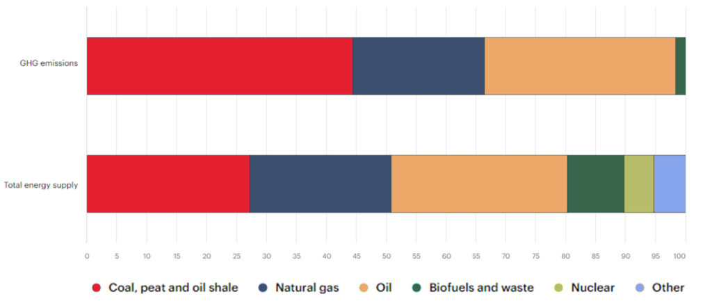 Figure 2: Share of GHG emissions and total energy supply by product, World, 2021