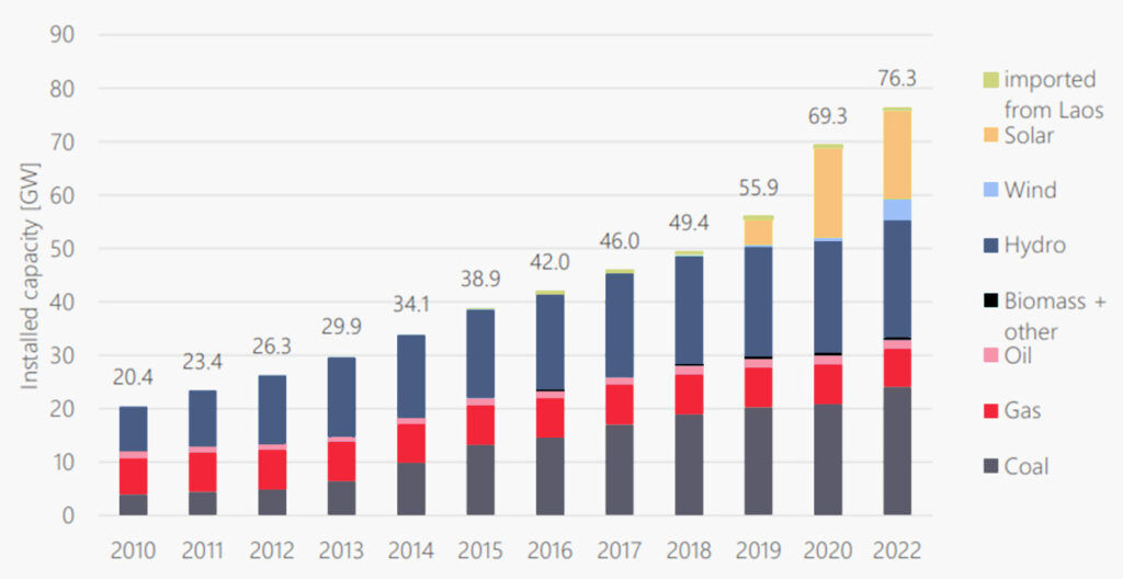 Vietnam’s power sector has a coal-dependent supply structure. In 2022, Vietnam’s total installed capacity was 76 GW, dominated by coal, natural gas and hydropower; however, the share of coal has decreased slightly since 2019 as a result of growth in solar and wind installed capacity (Figure 6).17