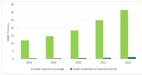 - Green insurance lacks comparable data due to institutional reforms and continuous policy adjustments. However, scattered information suggests that premiums totalled RMB 229.7 billion (USD 32.5 billion) at Q4 2023, and the outstanding investment in the green industry amounted to RMB 1.67 trillion (USD 236.3 billion) at Q2 2023.