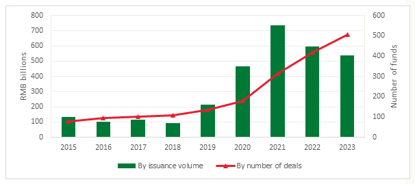 - In practice, the Wind ESG funds section employs a screening logic where funds are included if their product name, investment scope, investment goal, performance benchmark, or investment philosophy contains specific keywords. For the purpose of this report, we have selected relevant keywords including “green”, “sustainable development”, “ESG”, “environment”, “environmental protection”, “low carbon”, “carbon neutrality”, “climate change”, “new energy”, “beautiful China,” and “energy-saving”, for green funds analysis. The report categorised based on the fund establishment date, selecting products that are in operation and excluding funds that have been liquidated.