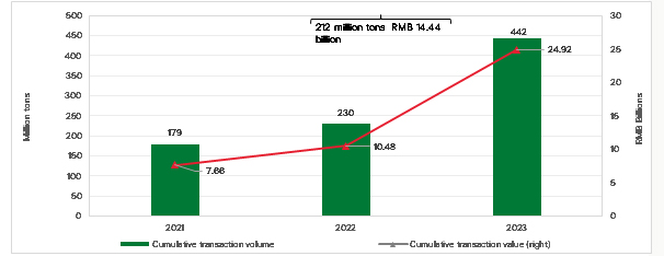- China’s national carbon market traded 212 million tons in 2023, with annual transaction value growing to RMB 14.44 billion (USD 2.04 billion) from RMB 2.81 billion (USD 397.62 million) in 2022. This growth is primarily due to the biennial compliance cycle, with 2022 being a non-compliance year, while daily transaction volume data does reveal a noticeable compliance-driven pattern.