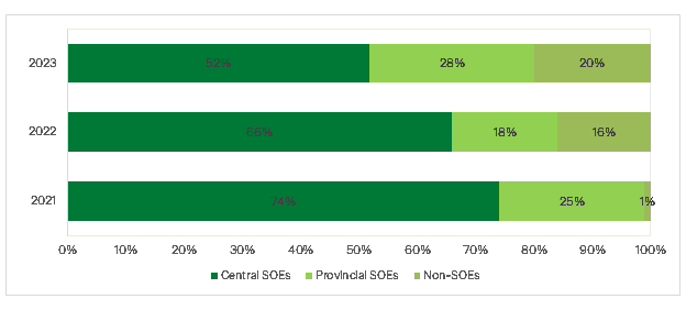 For central state-owned enterprises (SOEs), there has been ongoing progress in ESG disclosure. Following the issuance of the workplan by the State Council’s Assets Supervision and Administration Commission (SASAC) to mandate ESG disclosure for SOEs by 2023 , 86.8 per cent of SOE-holding listed companies have published independent ESG or social responsibility reports. In July 2023, SASAC introduced ESG disclosure regulations for listed companies under central enterprise control, featuring basic and recommended disclosure levels, along with a report template for technical guidance.