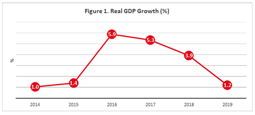 Before the onset of the Pandemic in early 2020, the Solomon Islands economy was already buffeted by anaemic growth outturns in 2019. The Central Bank of Solomon Islands (CBSI) estimates for real Gross Domestic Product growth for the year was only 1.2 per cent, much slower than the 3.9 per cent in 2018 (Figure 1). This was driven by very sluggish global market conditions and weaker domestic demand. Moreover, the economy decelerated considerably in the last six months of 2019. Key macroeconomic indicators showed a significant slowdown.