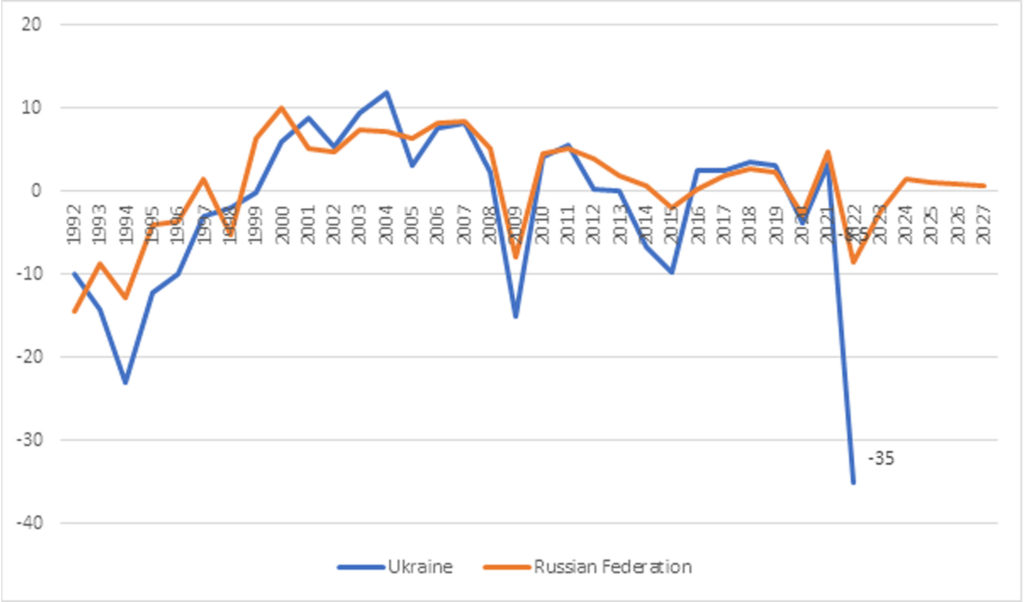 Figure 1: Real GDP growth (%), Ukraine and Russia, actual and projected, 1992-2027