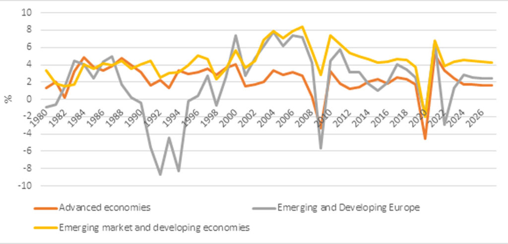 Other emerging economies will suffer too, especially those in Europe. Collectively, the emerging economies in the region are expected to experience a -2.9 percent contraction in GDP which is significantly higher than the pandemic recession of 2020. As can be seen (Figure 4), all the major regions of the world are expected to experience a growth slow-down after a sharp rebound from the pandemic recession of 2020.