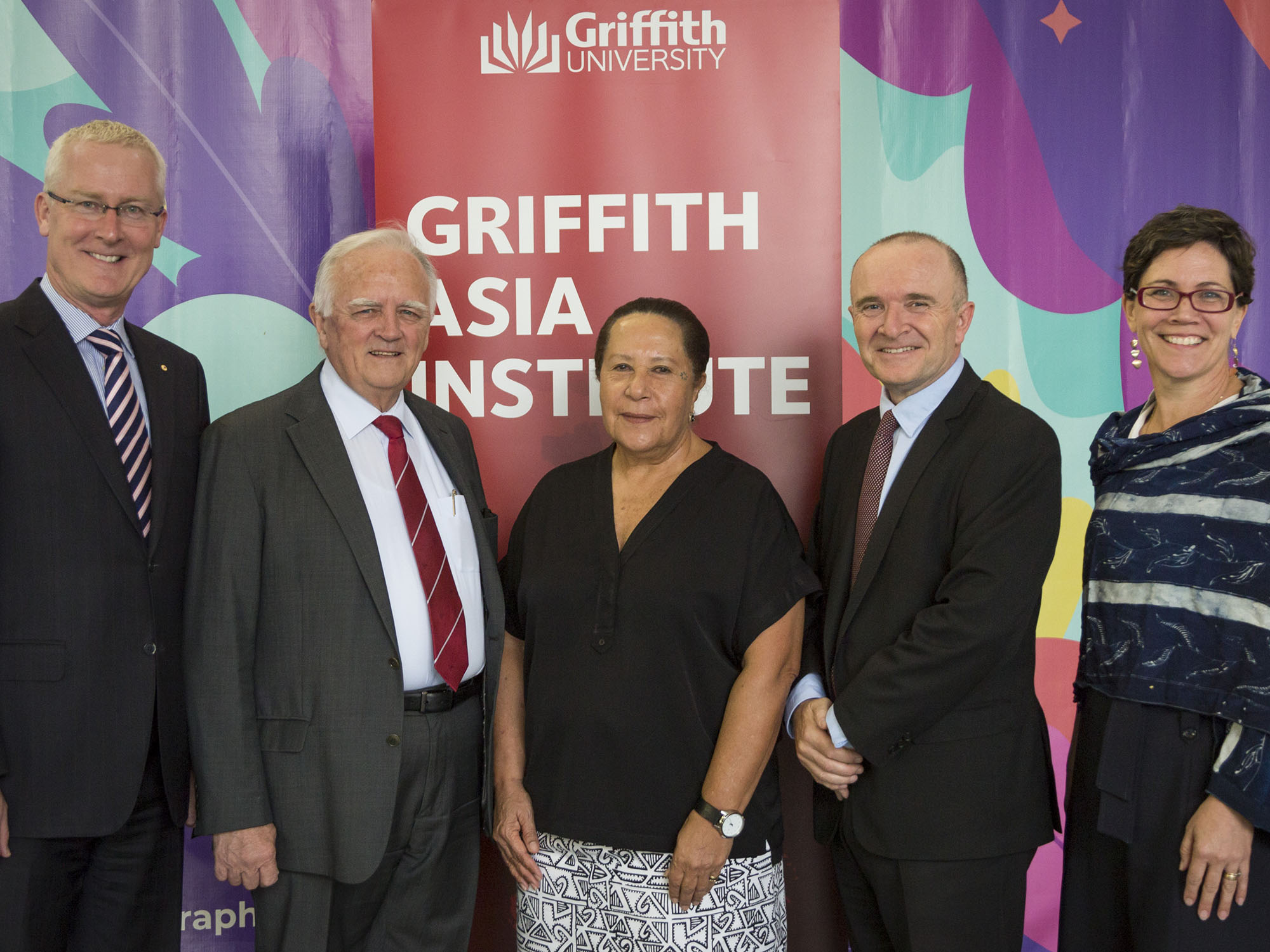 (L to R) Mr Bruce Miller AO, Chair, Griffith Asia Institute Advisory Board, Mr Henry Smerdon AM, Chancellor, Griffith University, Dame Meg Taylor, Secretary General, Pacific Islands Forum, Professor David Grant, Pro Vice Chancellor (Business), Griffith University and Professor Caitlin Byrne, Director, Griffith Asia Institute
