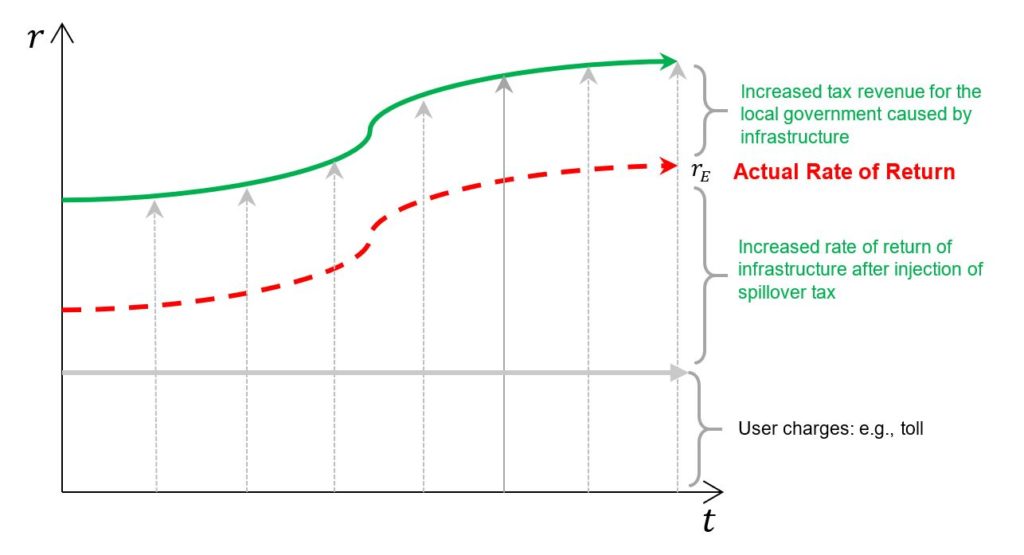 As a consequence, there has been a budget deficit in the public sector. It is thus essential to determine beforehand how risks should be shared between the public and private sector. A viability fund coming from tax revenues created by the spillover effects of infrastructure, such as highways and railways, could be an ideal solution to solve this issue, in particular for infrastructure projects which are indispensable for the public, but do not offer enough benefits to represent interesting opportunities for the private sector. Figure 1 illustrates this effect. The figure clearly shows that the rate of return for the private sector for this project will be increased, hence making it more attractive. Private funds can also be introduced in projects thanks to toll revenue. However, if the toll revenue is too low, there is a possibility that the private sector would not put their money into the project at all.