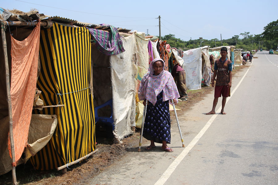 A disabled woman affected by floods is standing in front of a temporary shelter. (Shutterstock)