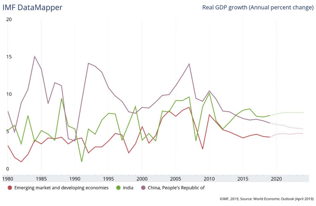 There is a sizeable India-specific literature that claims that these revisions led to unintended consequences entailing GDP mis-estimation and thus distorting the real GDP growth rates. Given that economic growth is the primary metric by which governments across the world make the claim of economic success (or lack of it), one can appreciate the gravity of these issues. In an Indian context, this acquires a great deal of salience because of the oft-cited claim that India is one of the fastest growing economies in the world and will remain so for some time. Indeed, the latest projections by IMF show India as a star performer relative to China and other emerging economies – see Figure 1.