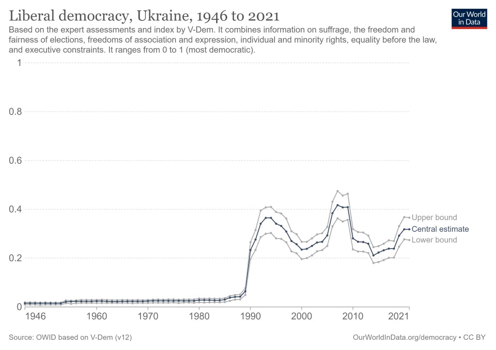 The well-known ‘Varieties of Democracy Institute’ (V-Dem) uses a cardinal measure of liberal democracy index (LDI), with 0 being the least democratic and 1 being the most democratic. This can be combined with expert assessments to assess the state of democracy in Ukraine and its trajectory over time.